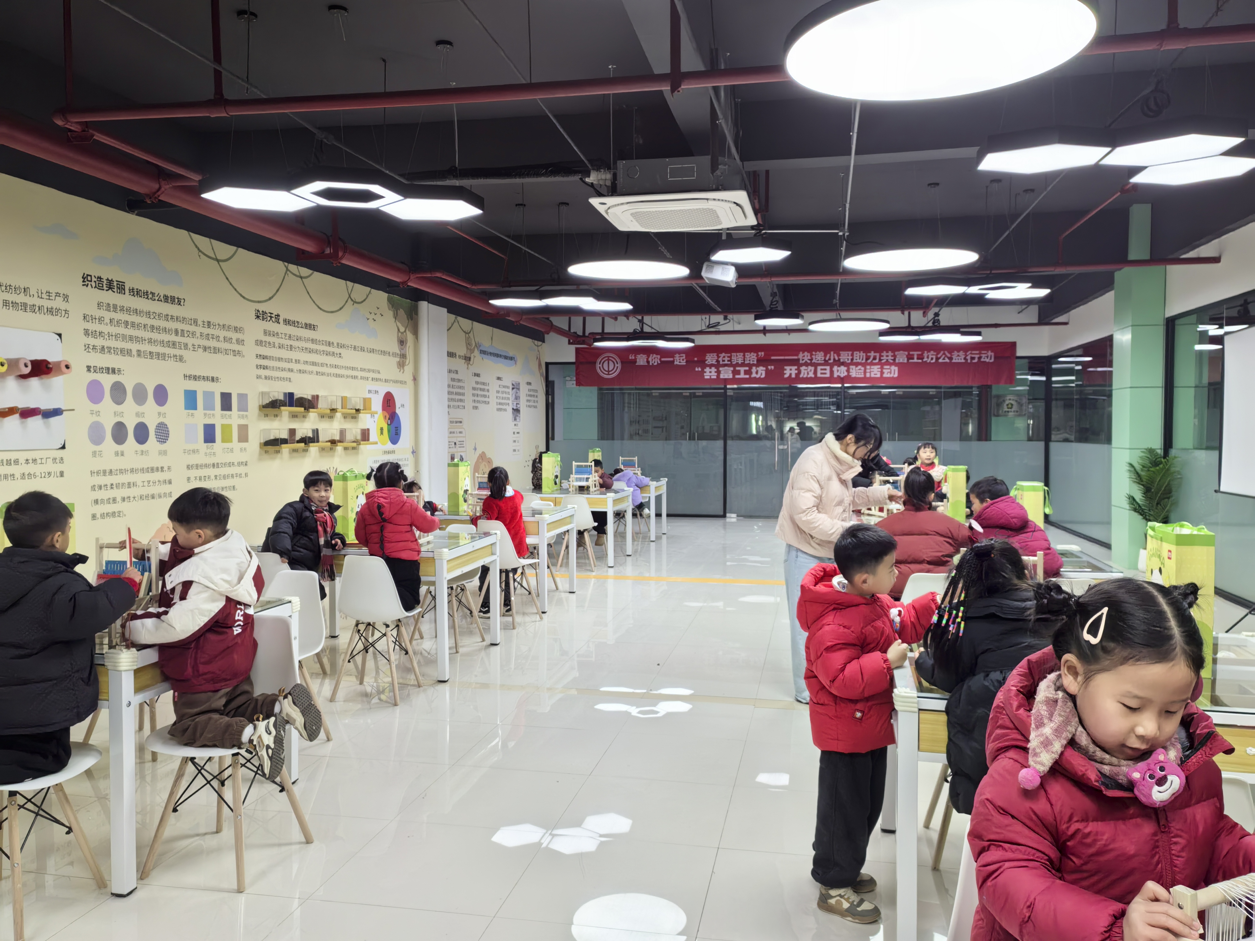 活动的另一个环节在汤浦童装城的共富作坊研学基地展开。快递小哥的子女们化身为“小小物流探秘员”,在快递员的带领下,开启了一段有趣的童装快递之旅。孩子们亲眼观摩并动手体验了童装产品从检查、叠装、打包、贴单到分拣的完整出库流程。快递员们耐心讲解每一个步骤,回答孩子们充满童趣的提问,现场充满了好奇与欢笑。